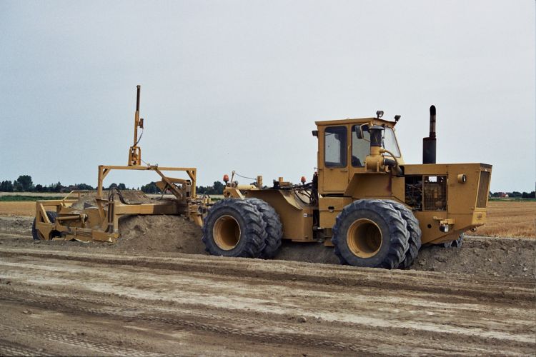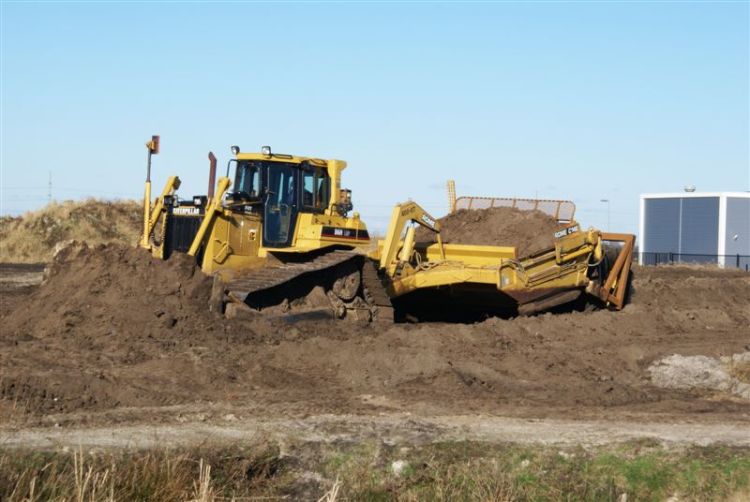 De scraperbakken kunnen ook achter de bulldozers geplaatst worden: