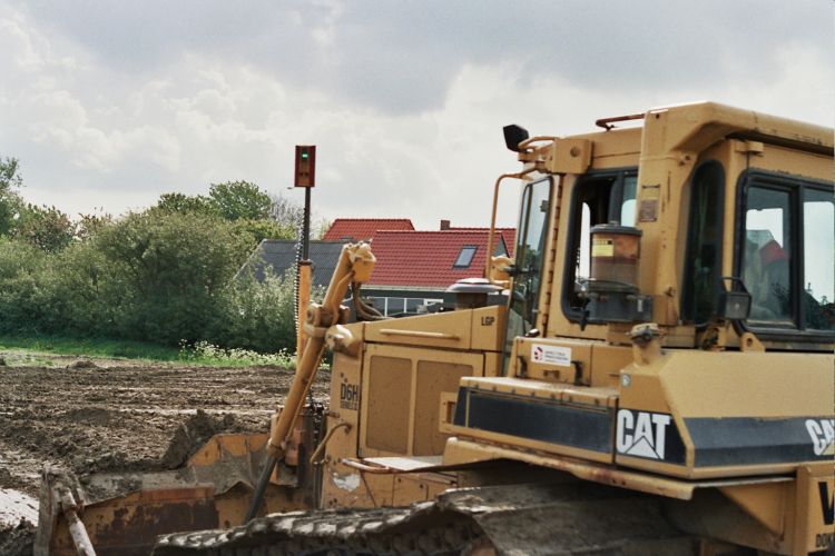 Ook de trekkers en scraperbakken hebben een volautomatische hoogte regeling. Daarom staat er ook een paal met laser ontvanger op de scraper.