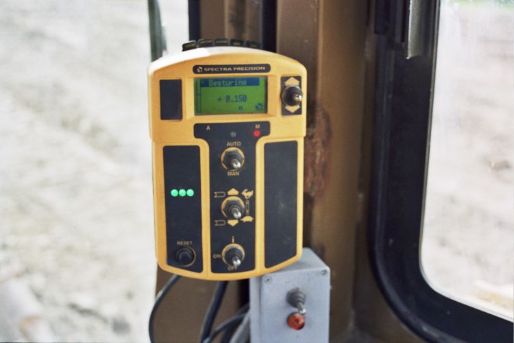 Op deze controlbox stelt de machinist de hoogte in. De controlbox stuurt dmv elektrohydraulische kleppen de cilinders van het blad aan. Het blad heeft dus altijd de juiste hoogte. En daardoor wordt een perfecte constante helling verkregen zonder kuilen of bulten.